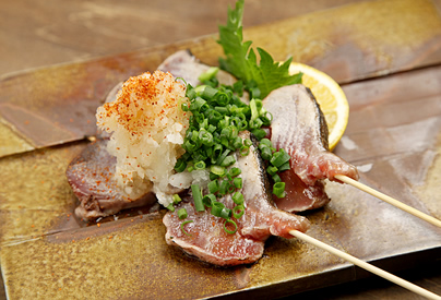 大分県産 豊の軍鶏たたき¥1,300しっかりとした歯ごたえとコクと旨みを、香ばしく閉じ込めて。 |